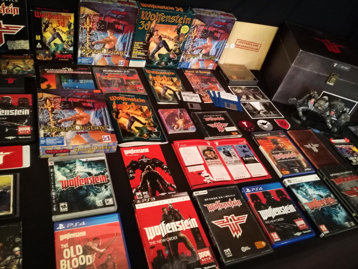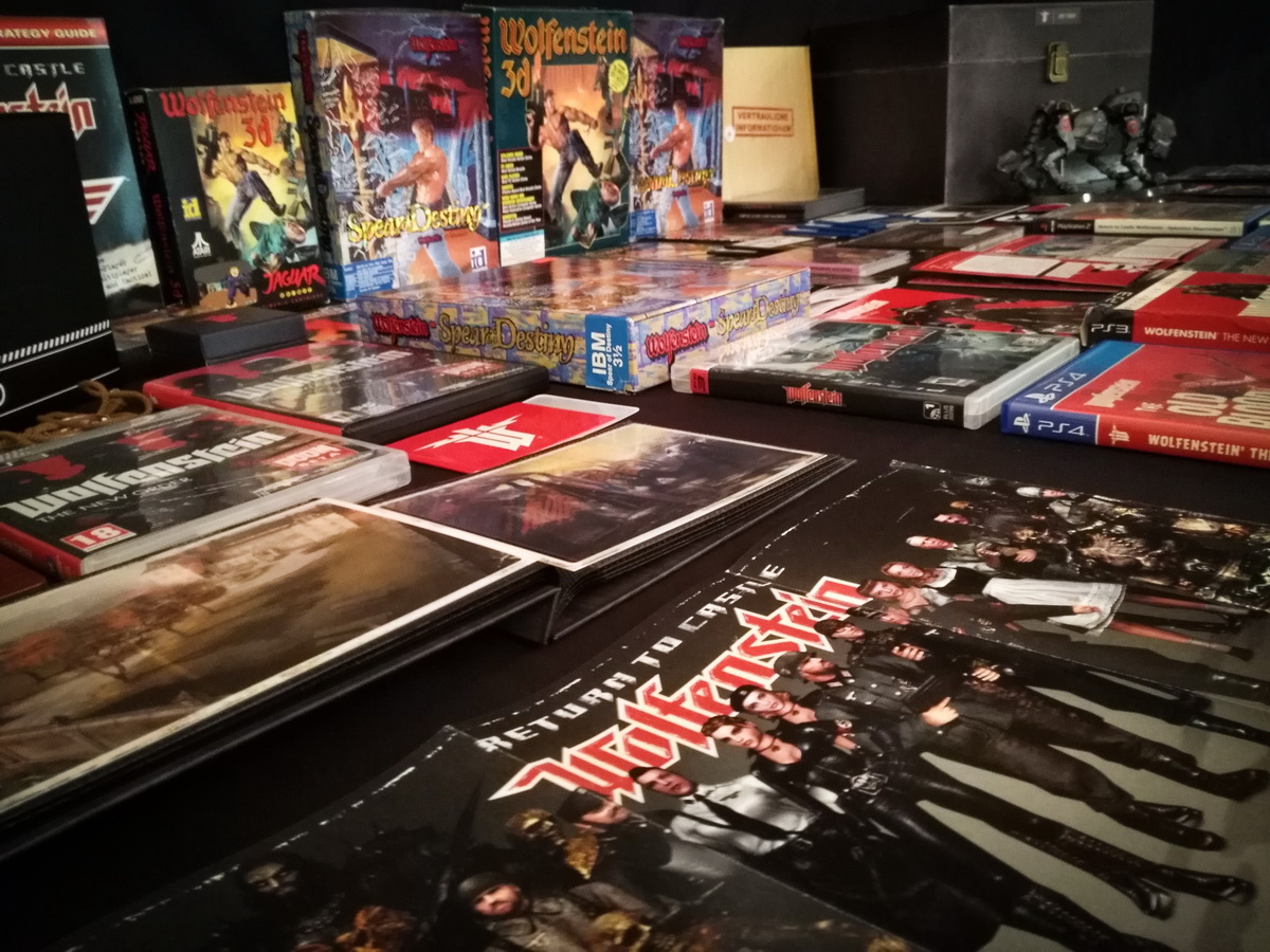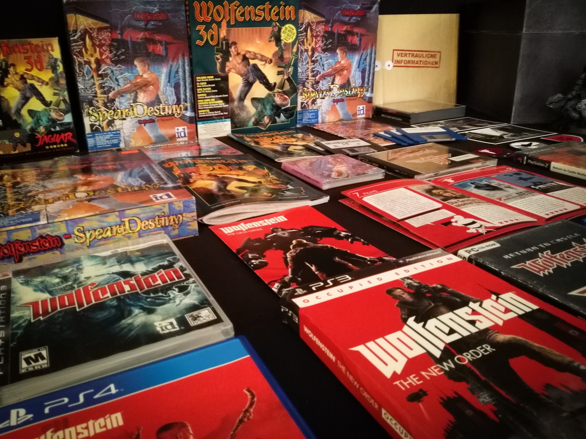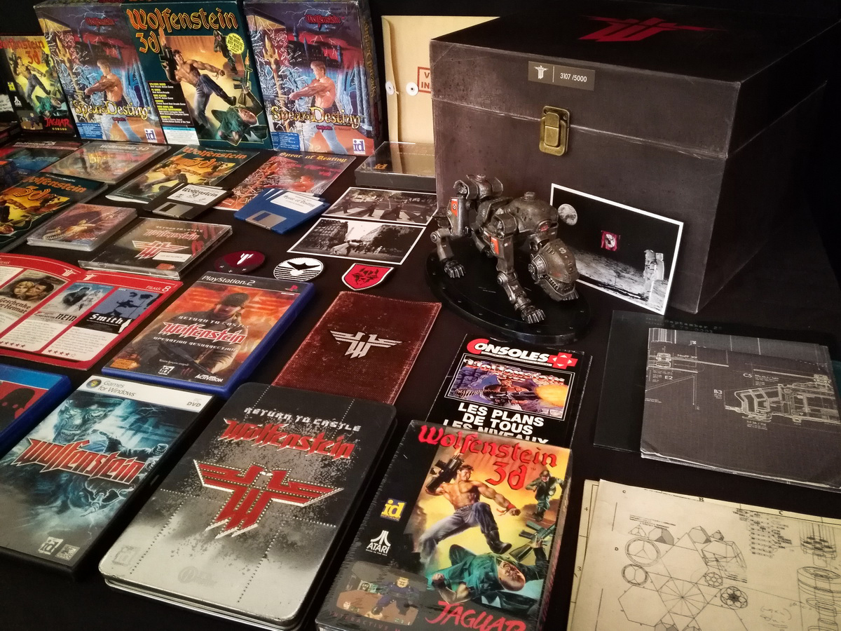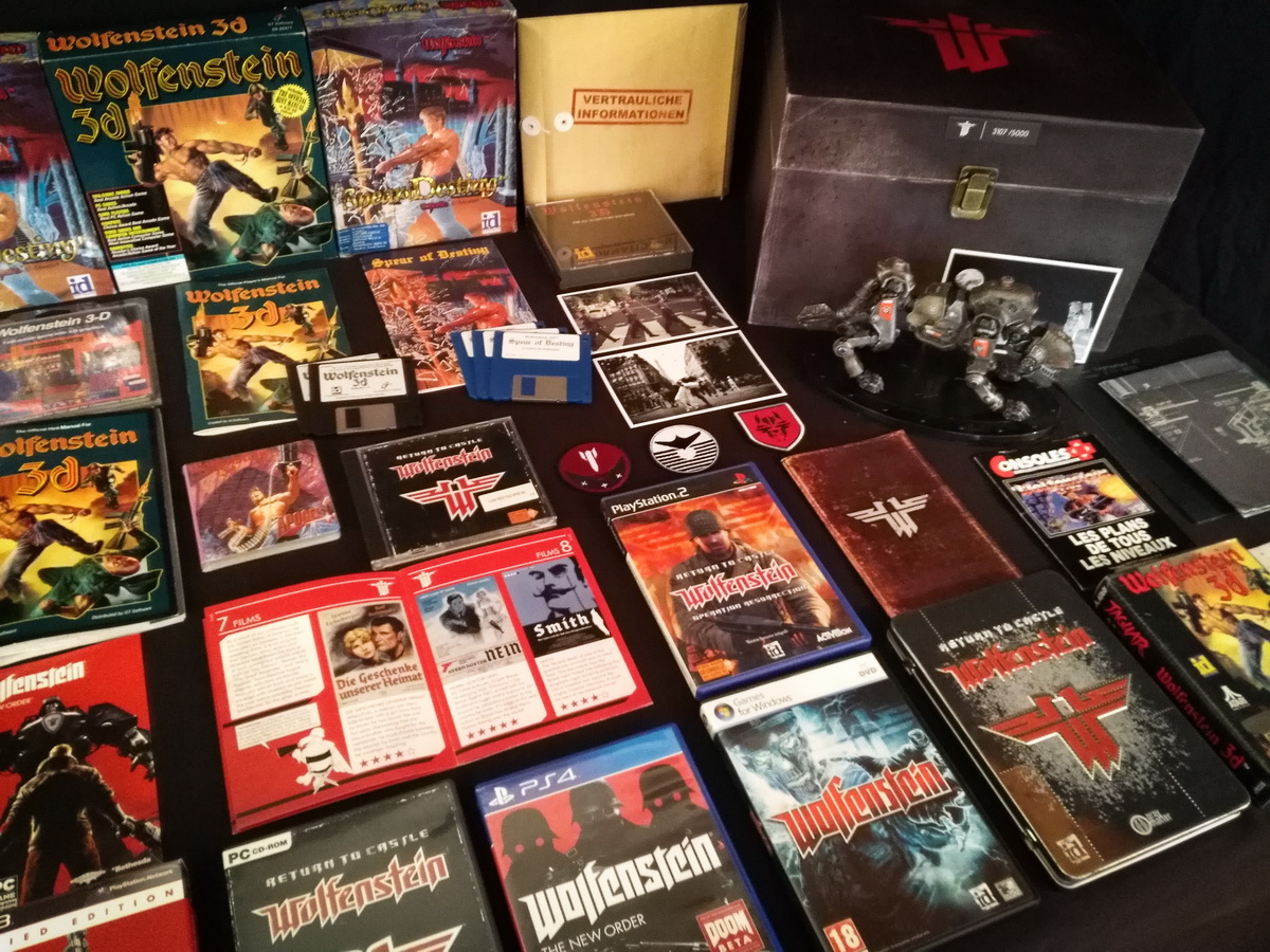 Environs 50 boîtes de jeux (versions USA, EUR, JAP) Goodies, posters, magazines… LAN pour 4 joueurs : 4 laptops HP Wolfenstein jouable sur : Atari Jaguar Super Nintendo Sony PS3 PC 486 DX2-50 Version « spilt-screen » à 2 PC récent pour Wolfenstein The new order, The old blood, Wolfenstein II : The new colossus