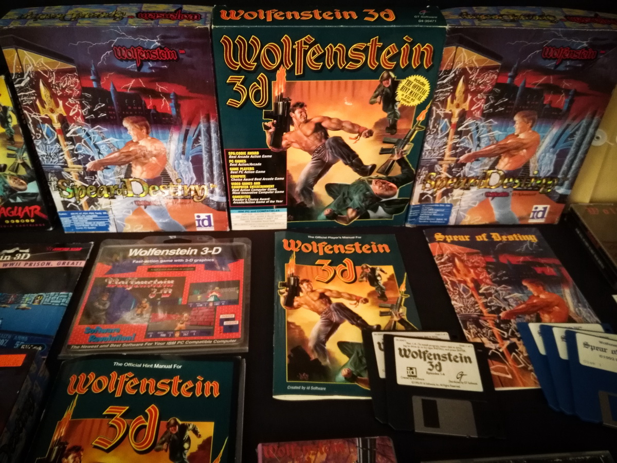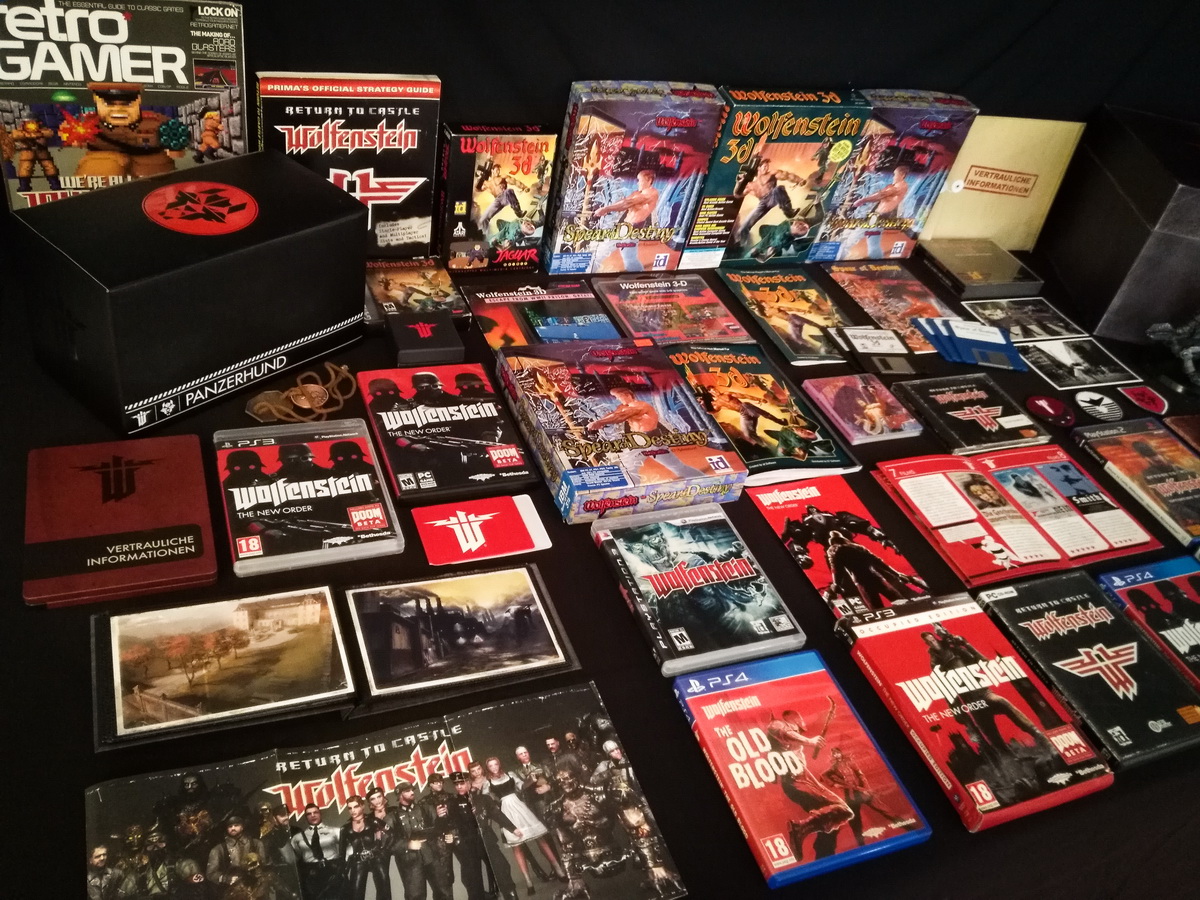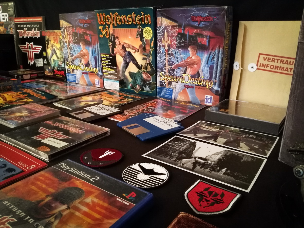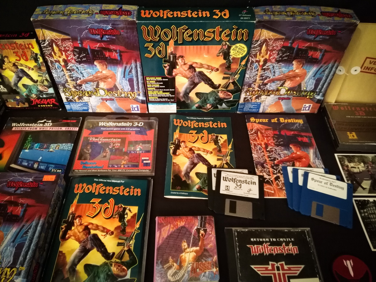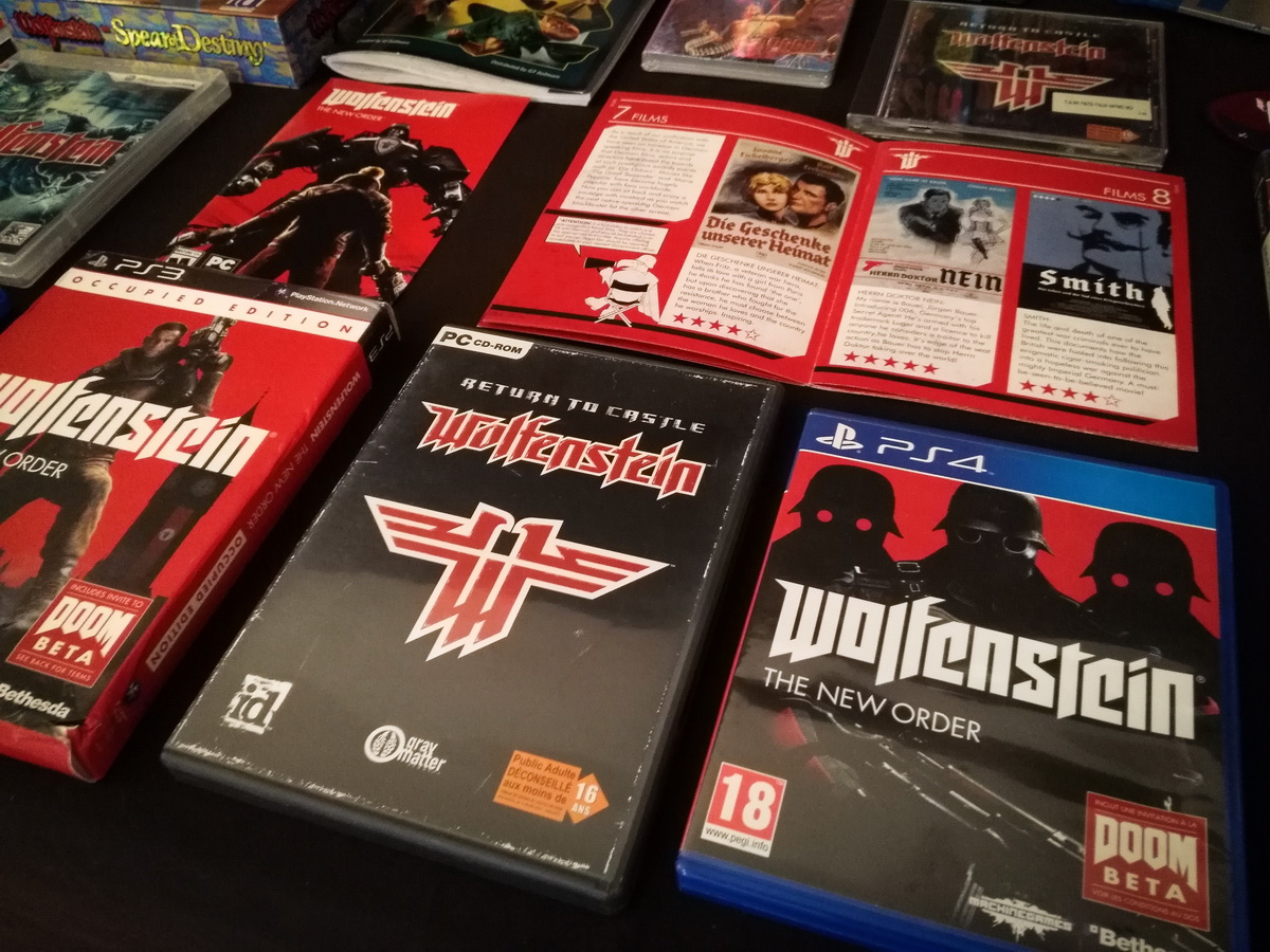 Environs 50 boîtes de jeux (versions USA, EUR, JAP) Goodies, posters, magazines… LAN pour 4 joueurs : 4 laptops HP Wolfenstein jouable sur : Atari Jaguar Super Nintendo Sony PS3 PC 486 DX2-50 Version « spilt-screen » à 2 PC récent pour Wolfenstein The new order, The old blood, Wolfenstein II : The new colossus