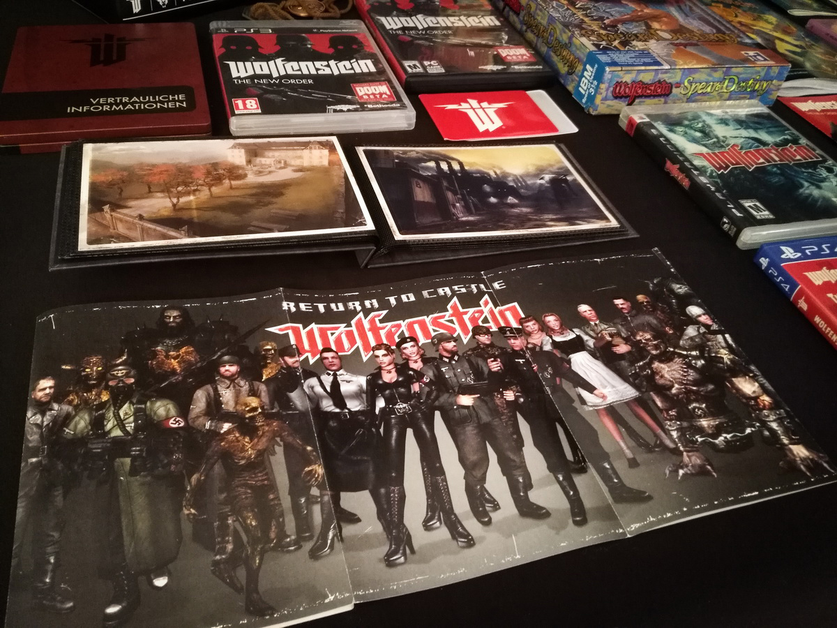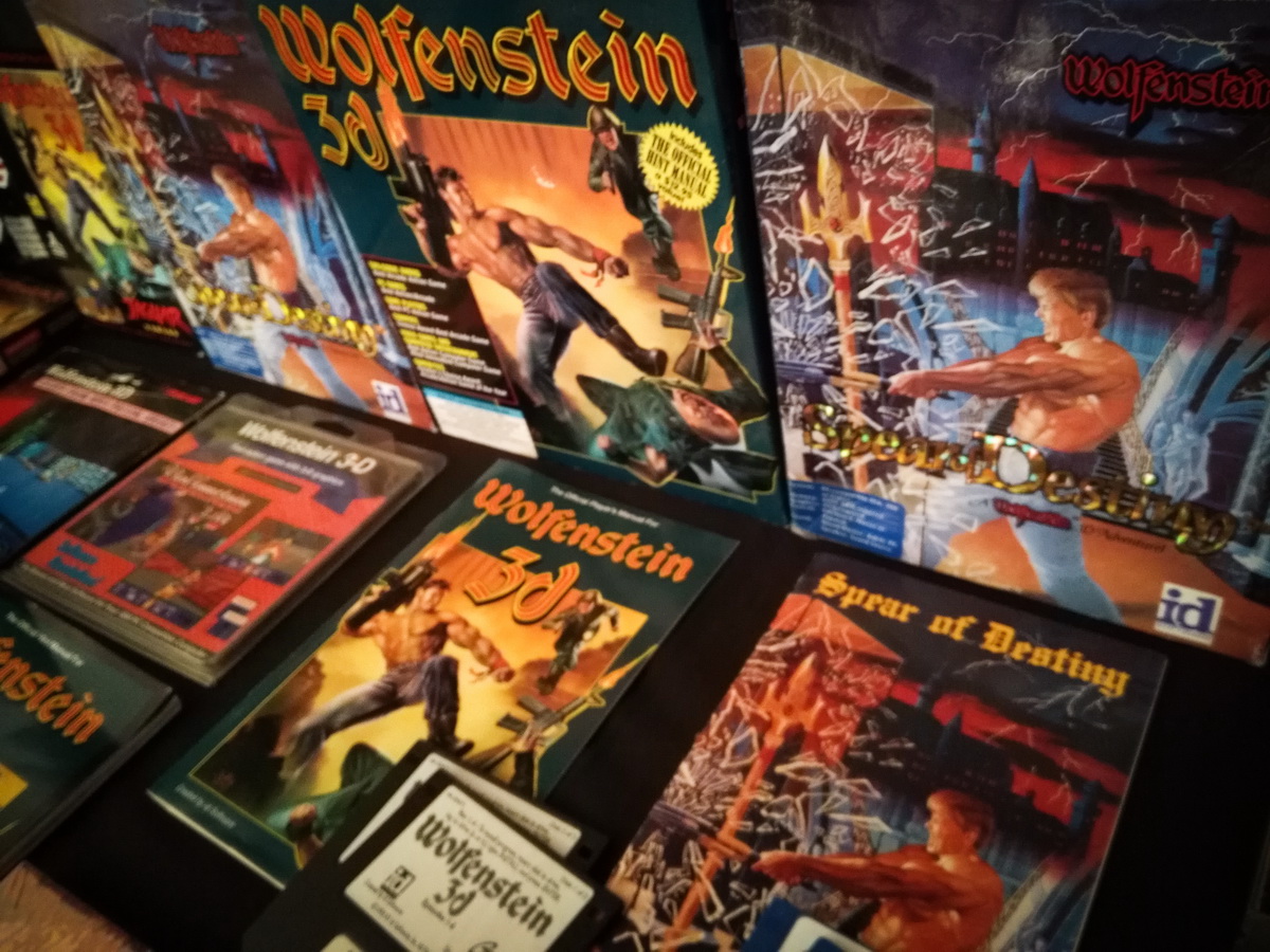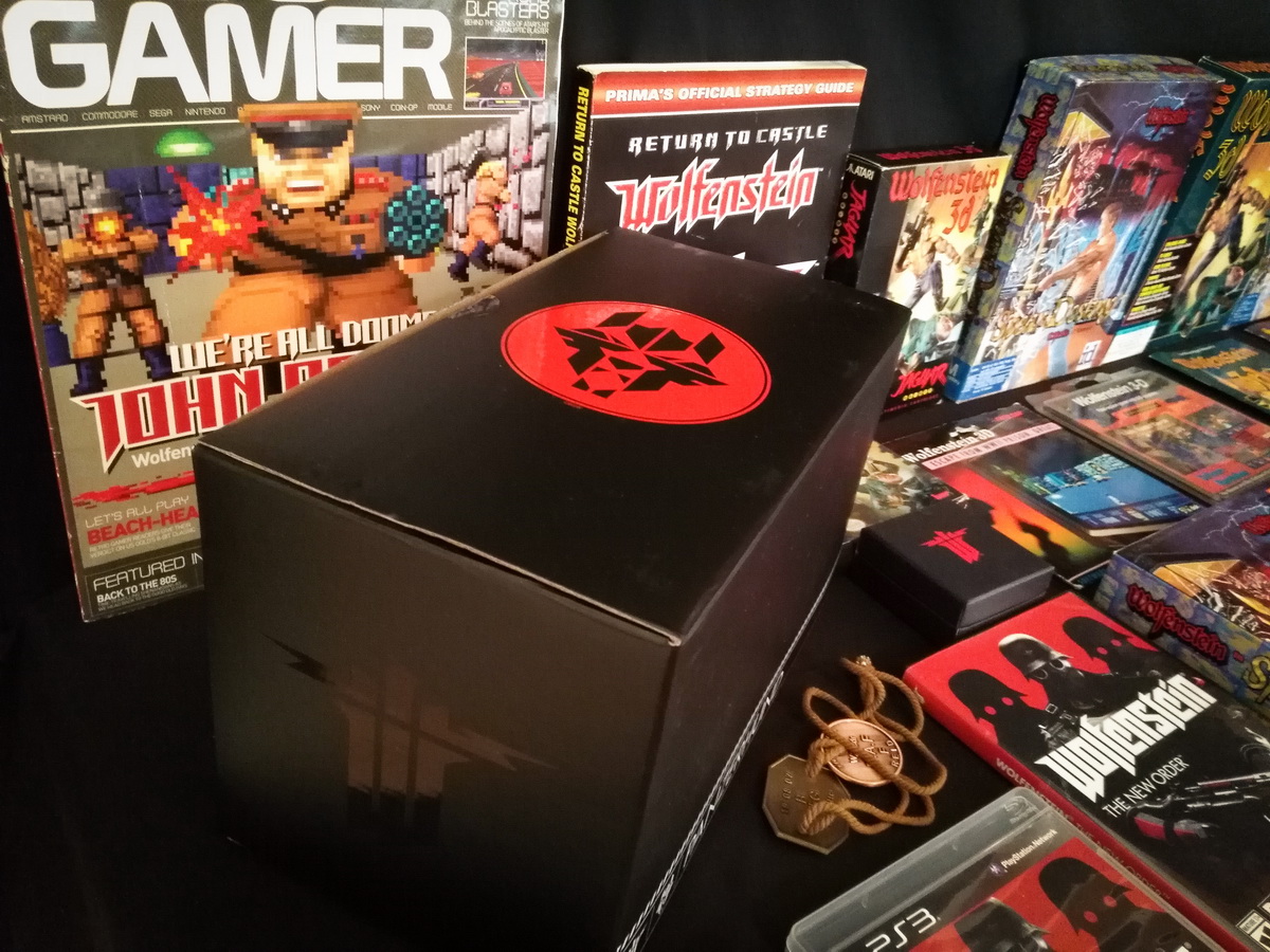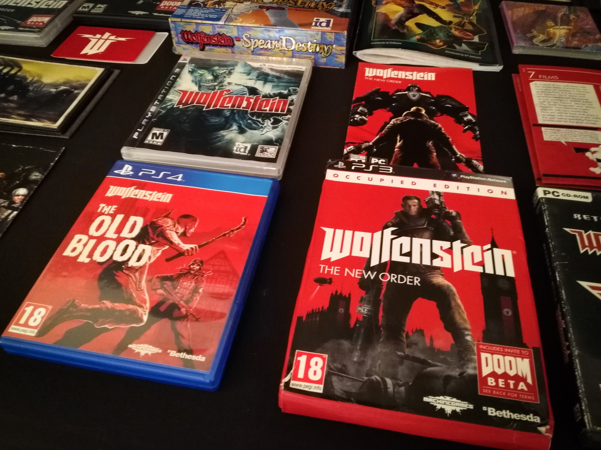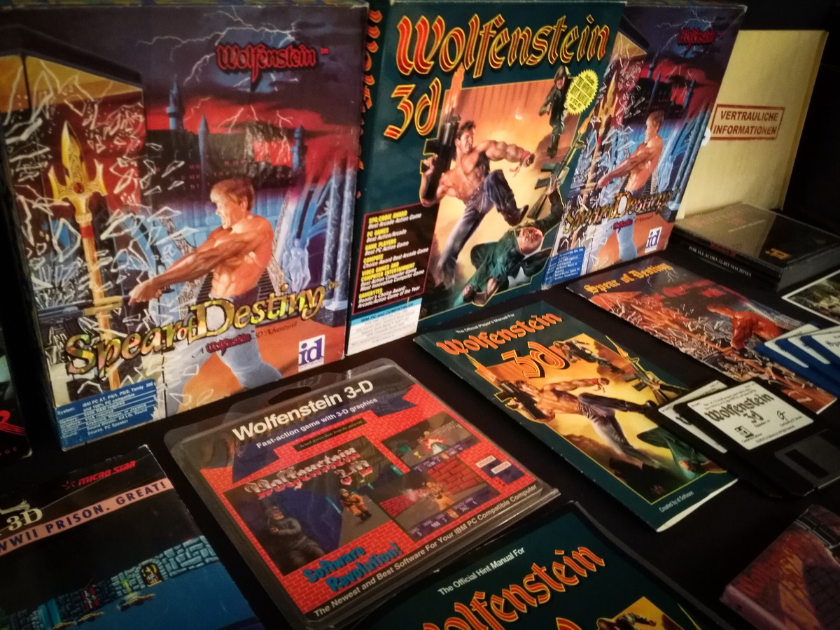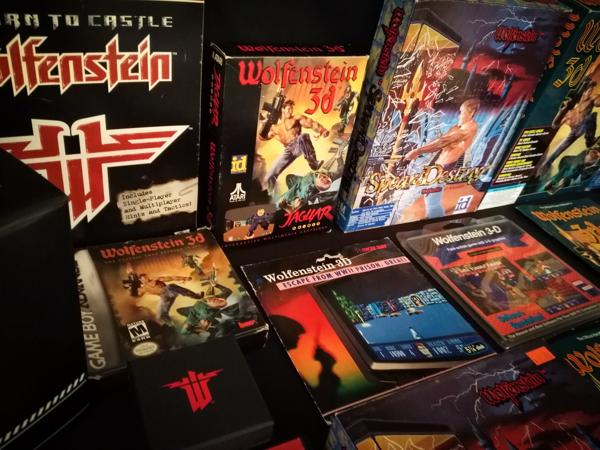 Environs 50 boîtes de jeux (versions USA, EUR, JAP) Goodies, posters, magazines… LAN pour 4 joueurs : 4 laptops HP Wolfenstein jouable sur : Atari Jaguar Super Nintendo Sony PS3 PC 486 DX2-50 Version « spilt-screen » à 2 PC récent pour Wolfenstein The new order, The old blood, Wolfenstein II : The new colossus