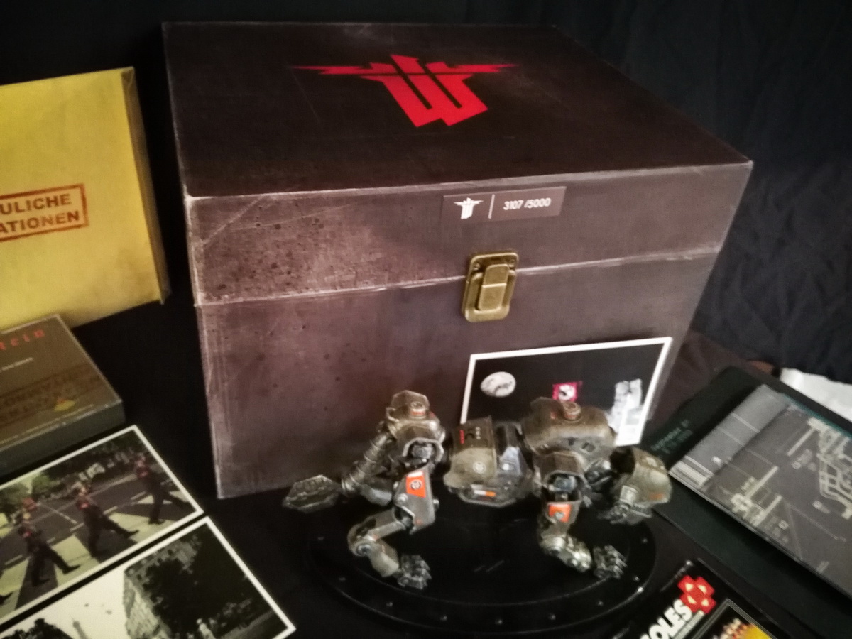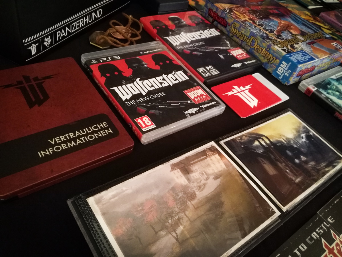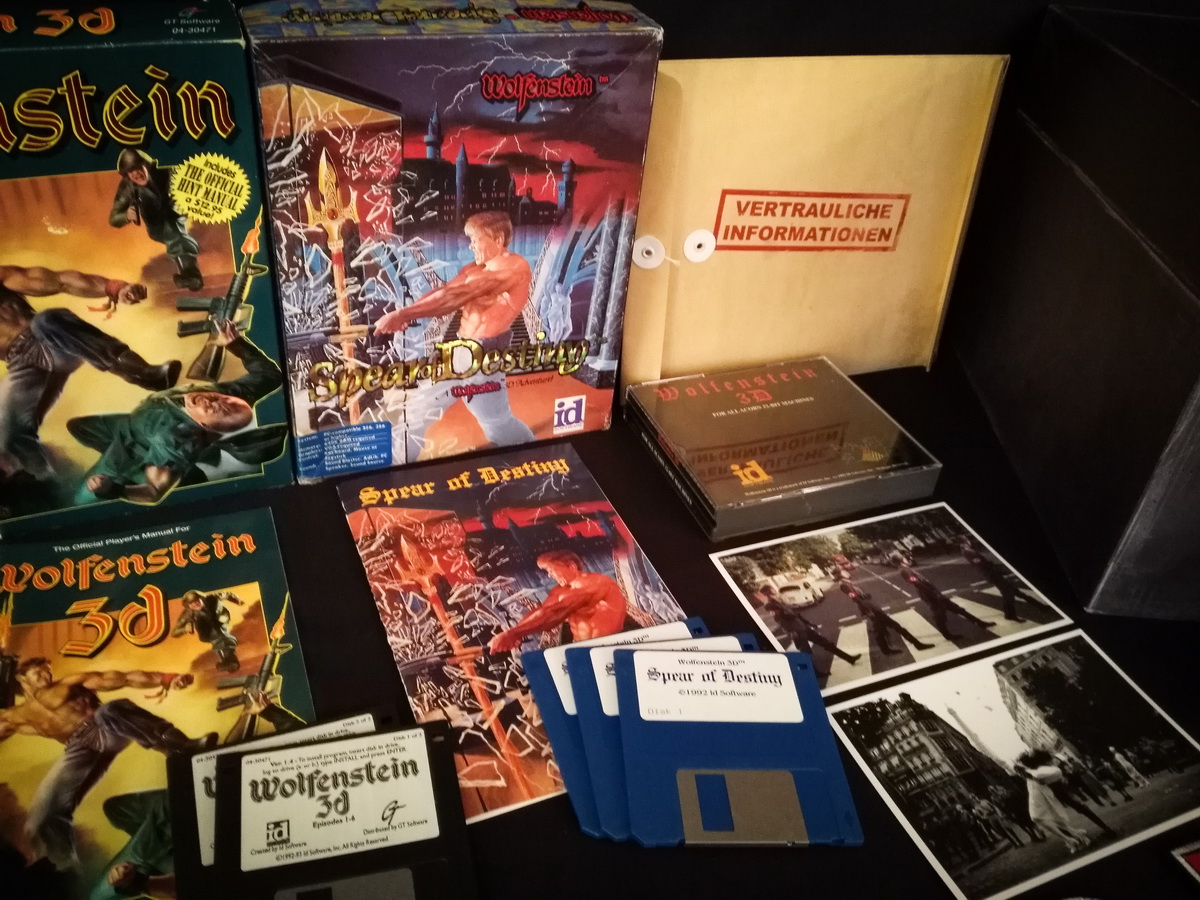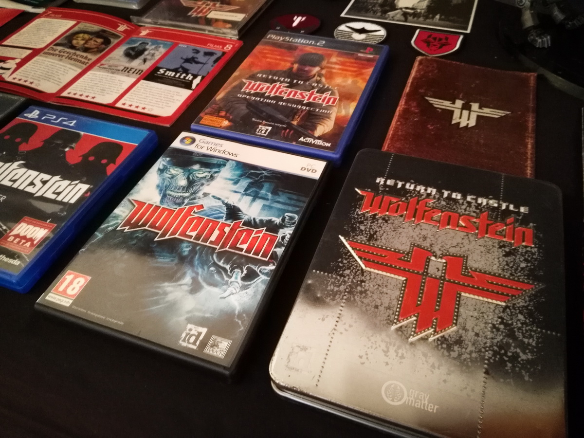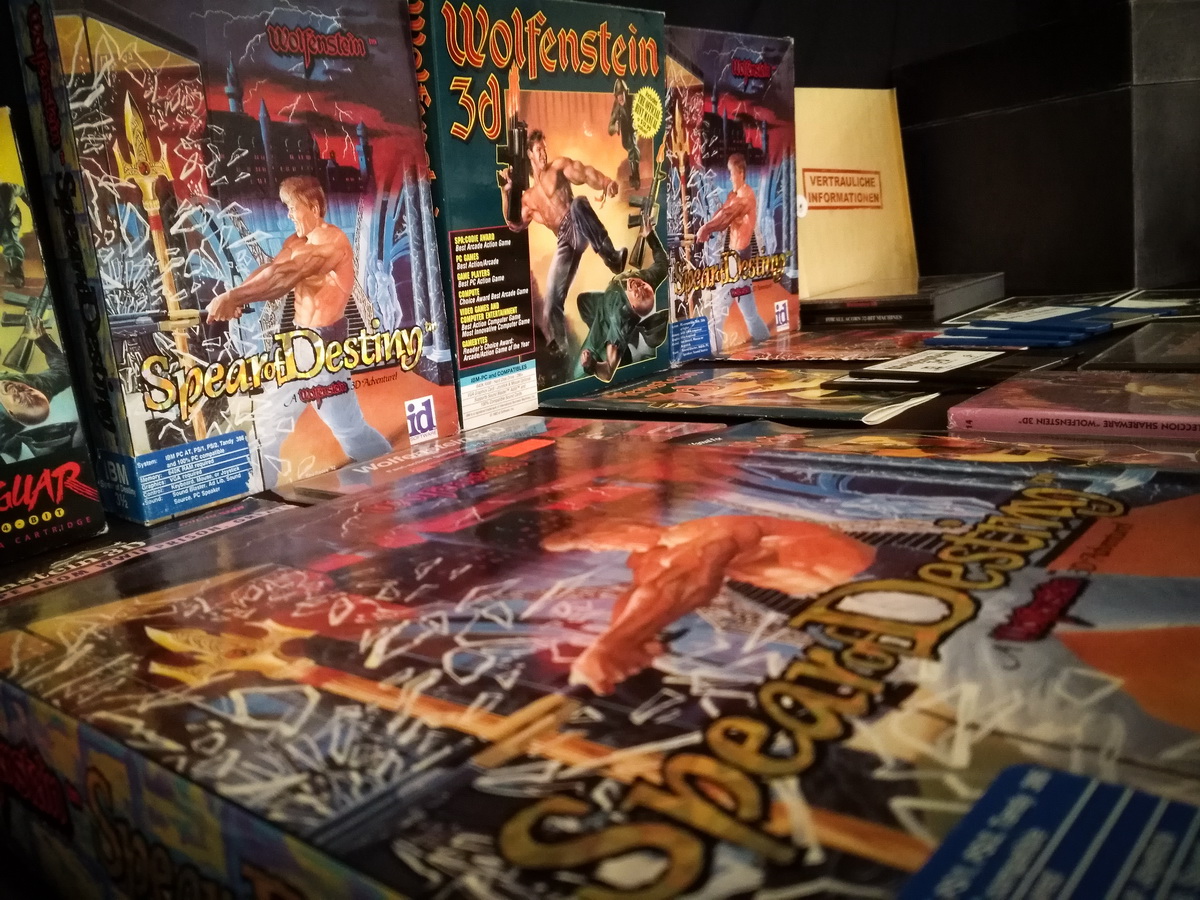 Environs 50 boîtes de jeux (versions USA, EUR, JAP) Goodies, posters, magazines… LAN pour 4 joueurs : 4 laptops HP Wolfenstein jouable sur : Atari Jaguar Super Nintendo Sony PS3 PC 486 DX2-50 Version « spilt-screen » à 2 PC récent pour Wolfenstein The new order, The old blood, Wolfenstein II : The new colossus